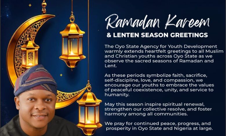 The Oyo State Agency for Youth Development has extended greetings to Muslim and Christian youths across the state as they mark the 2026 Ramadan and Lenten seasons.