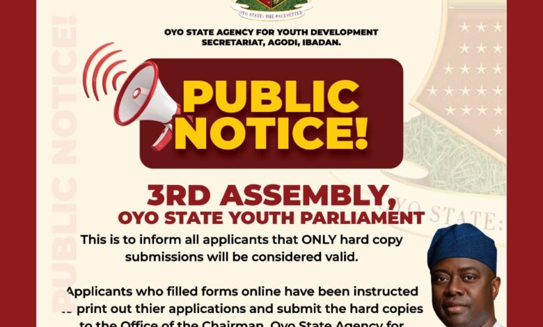 The Oyo State Agency for Youth Development has directed all applicants for the 3rd Assembly of the Oyo State Youth Parliament to submit hard copies of their applications, stating that only physical submissions will be considered valid for the selection process.